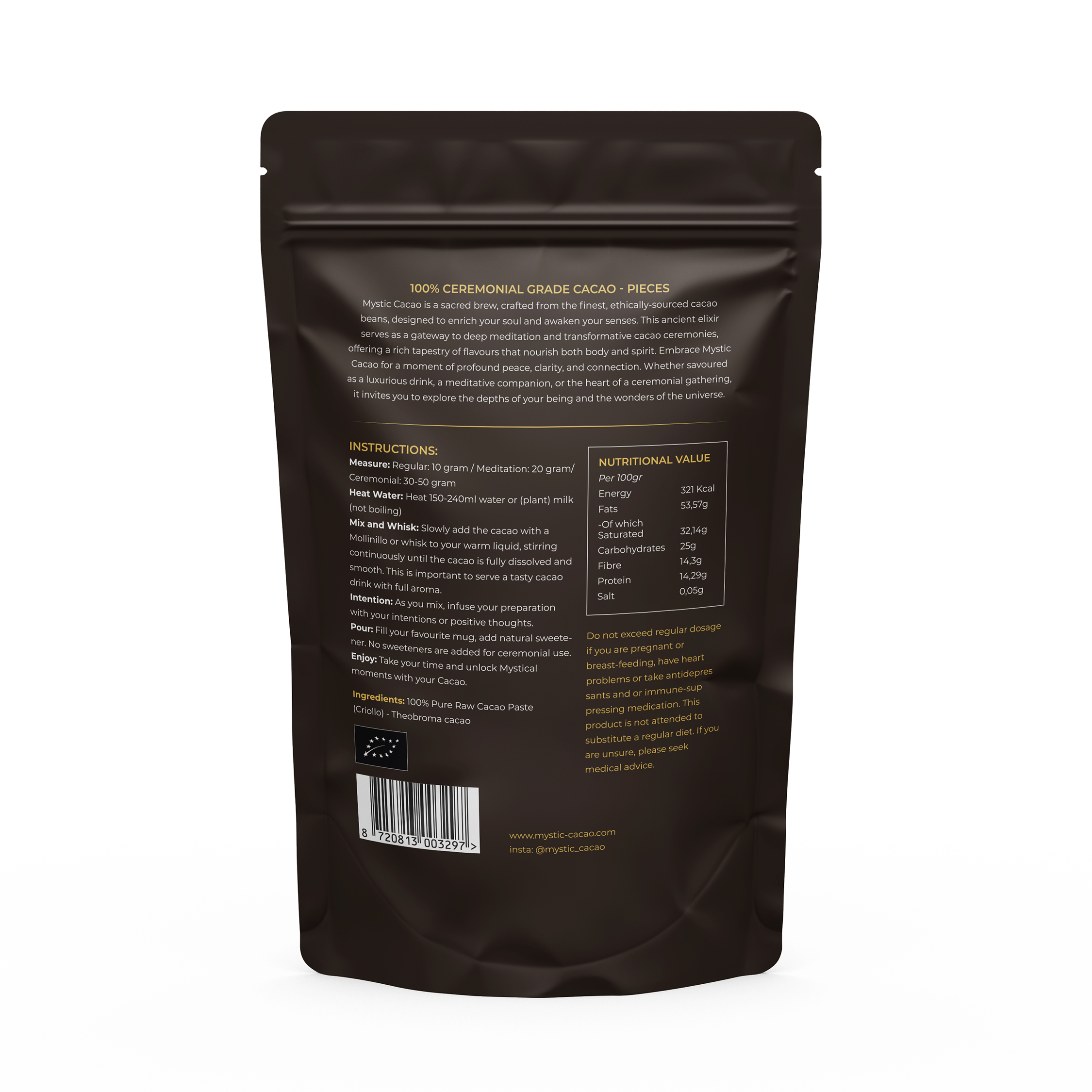 - Mystic Cacao is vervaardigd uit de fijnste, ethisch verkregen cacaobonen, ontworpen om je ziel te verrijken en je zintuigen te wekken. Dit oude elixer dient als een poort naar diepe meditatie en transformerende cacao ceremonies, en biedt een rijk tapijt van smaken die zowel lichaam als geest voeden. Omarm Mystic Cacao voor een moment van diepgaande vrede, helderheid en verbinding. Of het nu genoten wordt als een luxe drank, een meditatieve metgezel of het hart van een ceremoniële bijeenkomst, het nodigt je uit om de diepten van je wezen en de wonderen van het universum te verkennen.