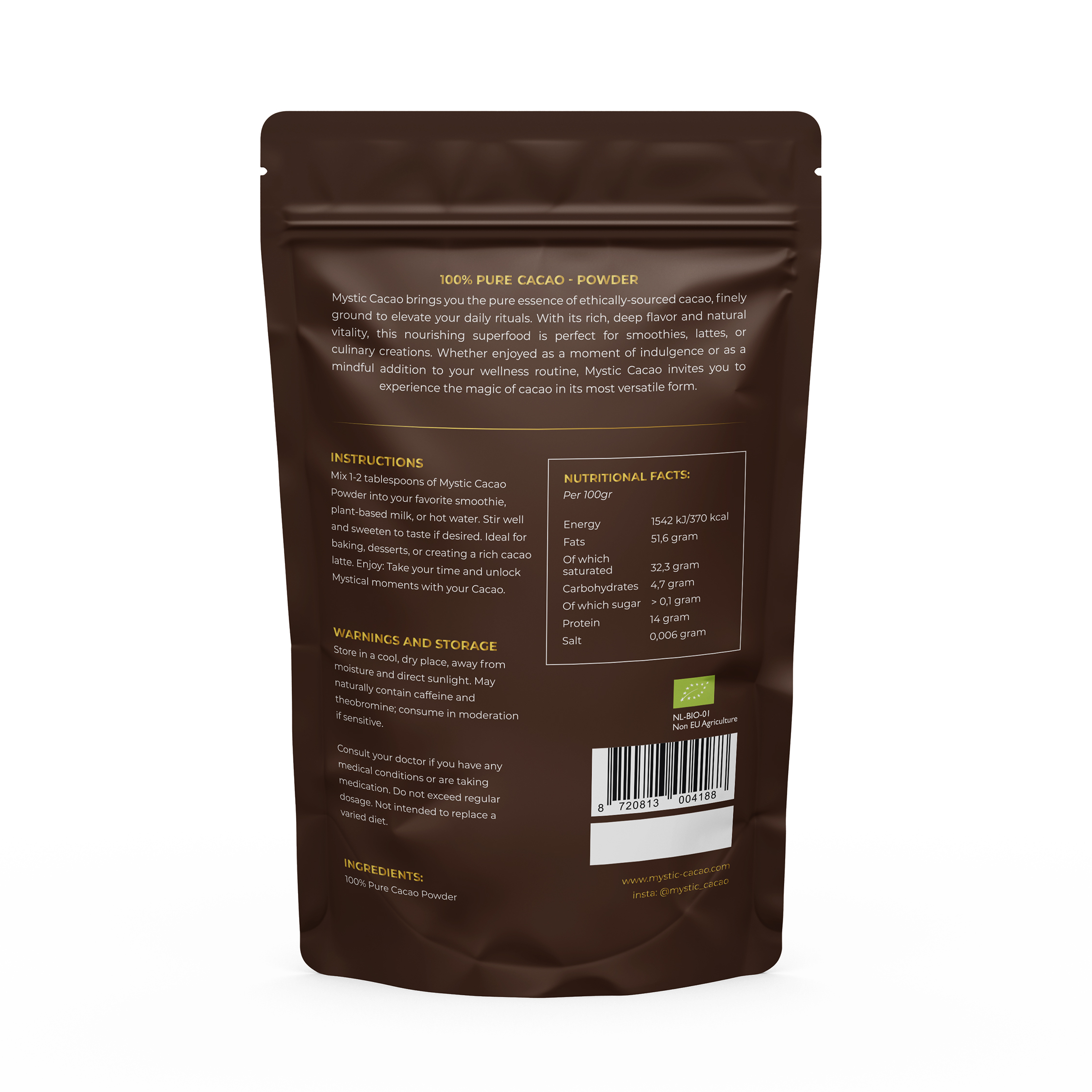 - Ingrediënten: 100% cacao poeder (biologisch).