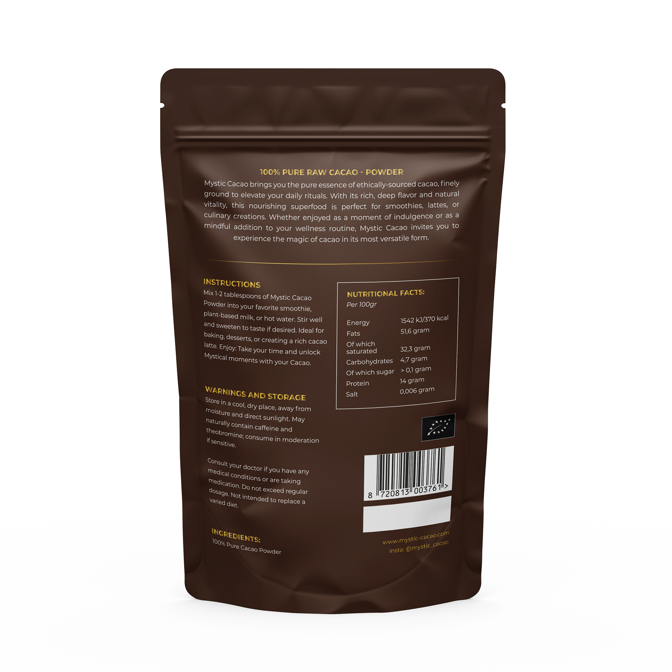 Met Mystic Cacao Poeder Raw haal je de essentie van pure cacao in huis. Of je nu een warme drank maakt, je favoriete recepten verrijkt of een cacao-ritueel creëert – Mystic Cacao is er voor jou.Ingrediënten Cacao Poeder